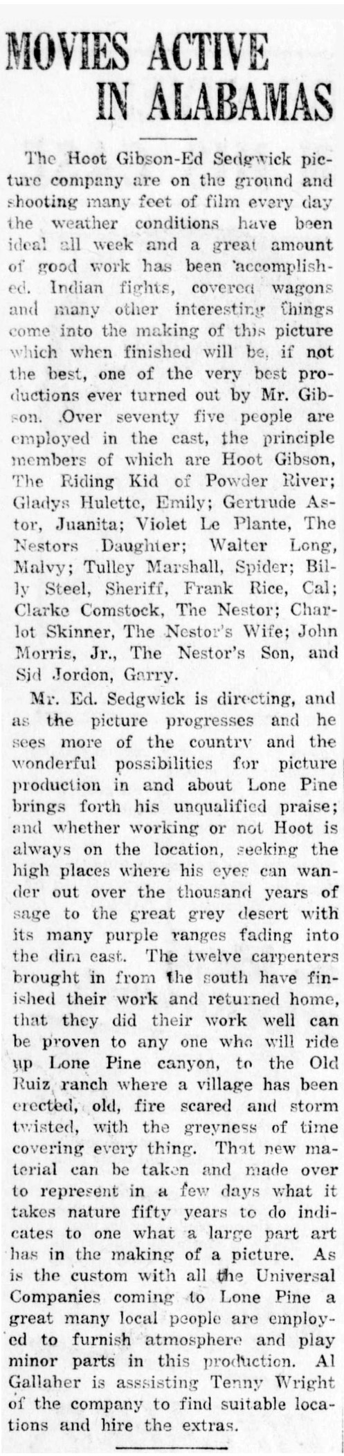 Hoot Gibson-Ed Sedgwich picture company are filming in the Alabama Hills of Lone Pine, CA. |
