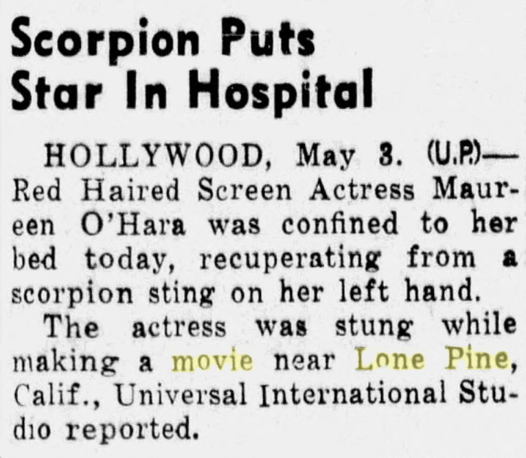 Maureen O'Hara recuperating from a scorpion sting on her left hand while filming a movie in Lone Pine, CA. |