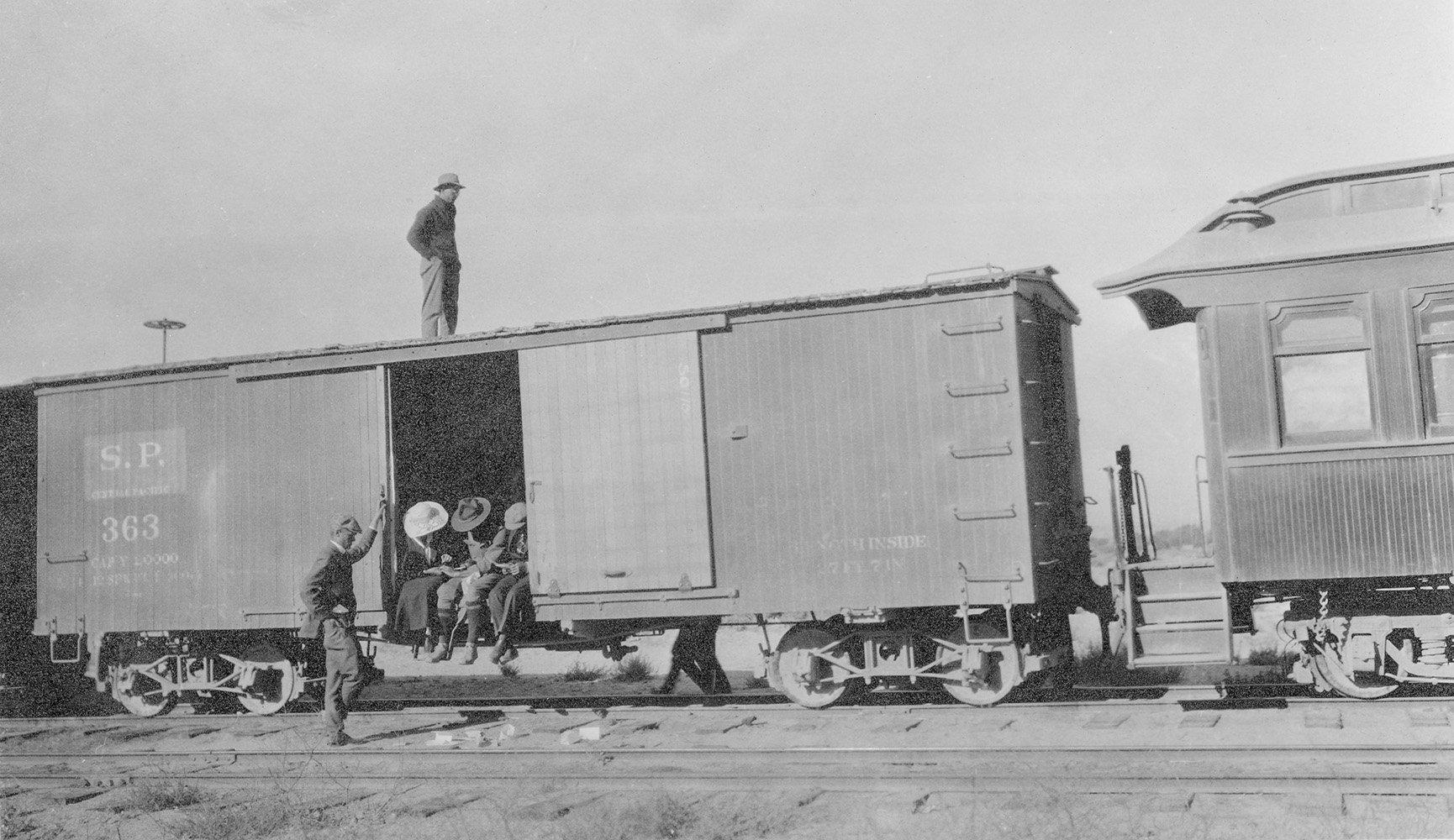 1916 Sierra Club "High Trippers" taking a break in baggage car 363 before heading home after their trip.