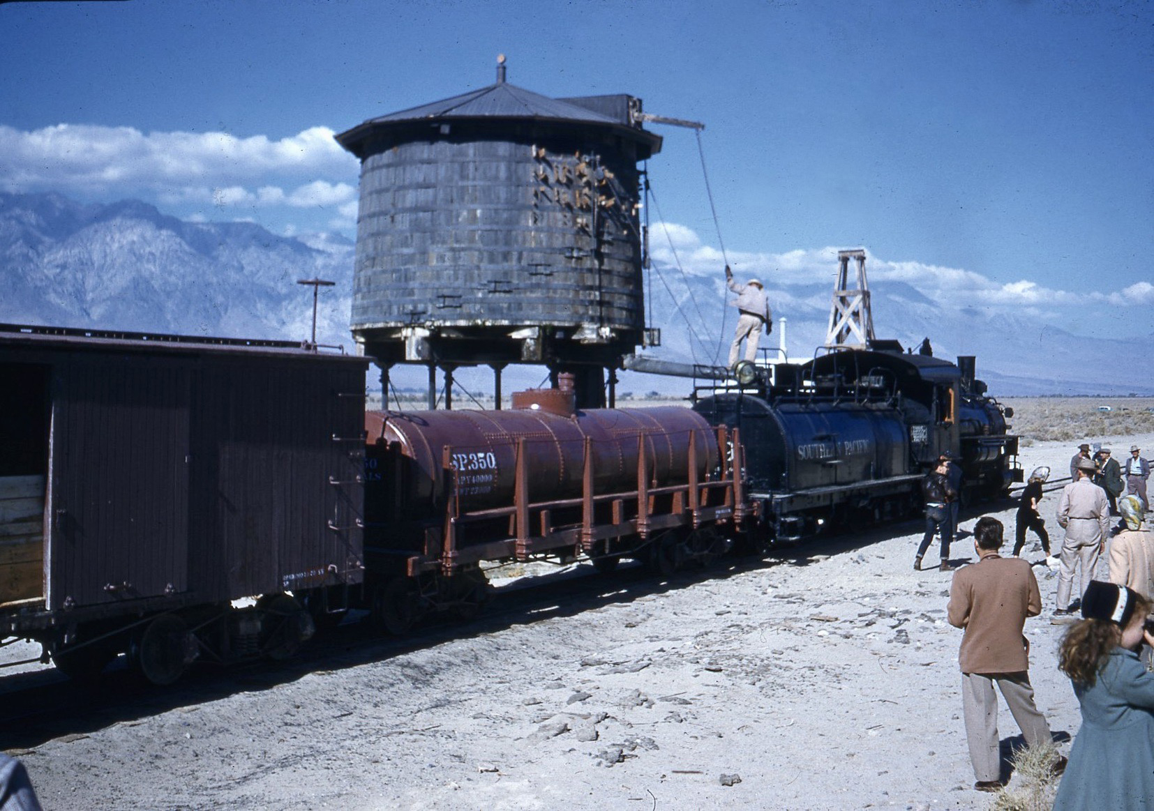 Water tower and flat car on the SPNG in Owens Valley at Kearsarge. |