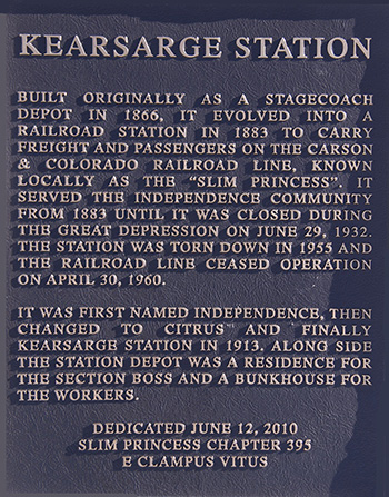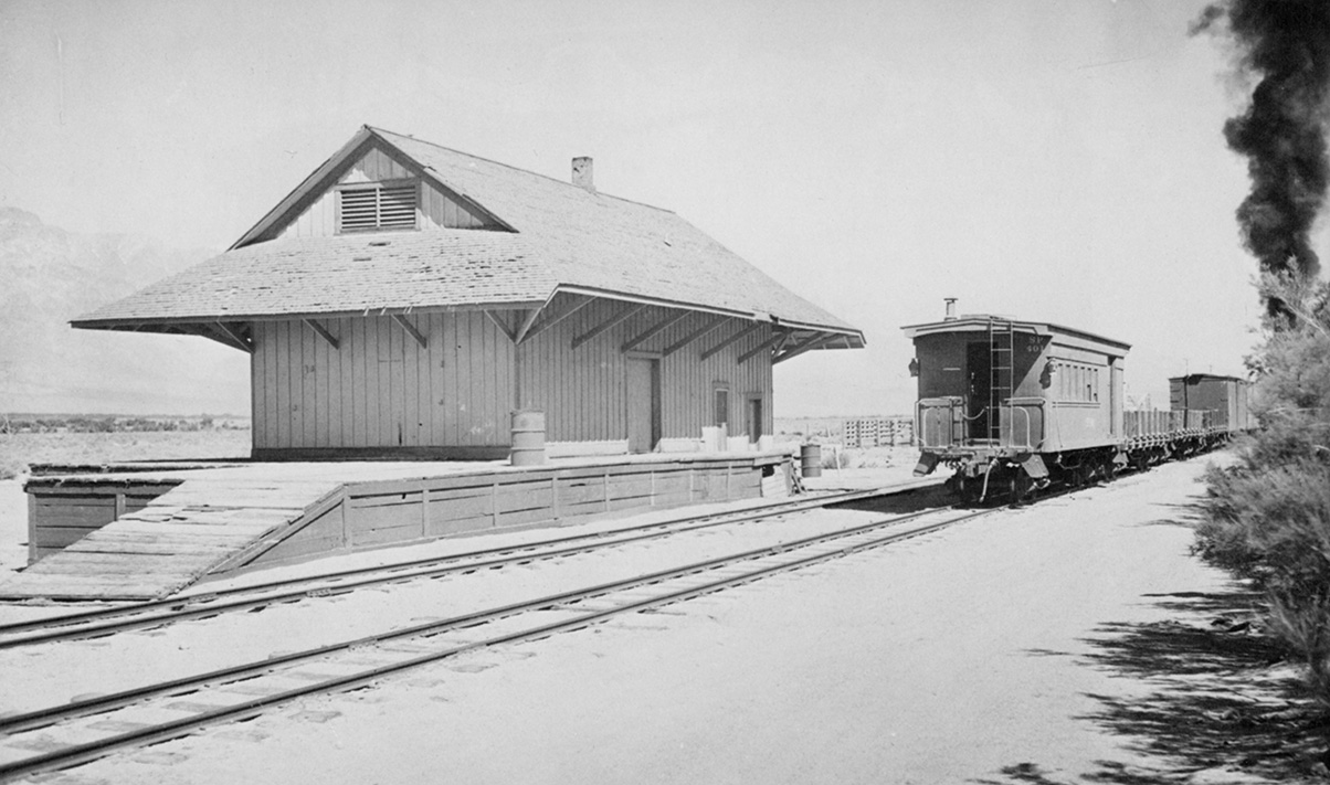 Kearsarge looking North, this would be considered west by the railroad. Depot on left with a string of gondola cars sitting in front on the siding track. On the right closest to the track is the speeder/tool shed and just to the right of it is one of the crew houses. Inyo/White mountains on the far right. The water tank and pump house from photo 1 would be behind the photographer to the left across the tracks.