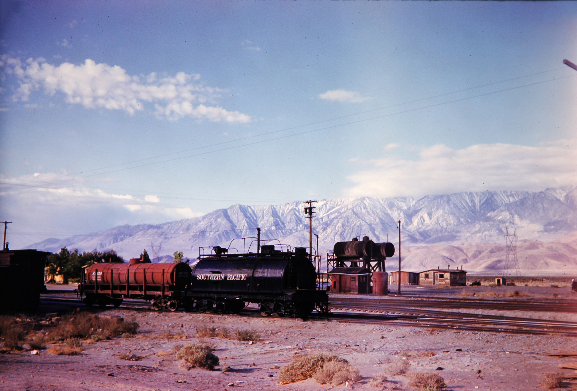 It was there in the late 1950's that the mighty Southern Pacific hung onto the former Carson & Colorado narrow gauge railroad operating then as the Keeler Branch. Not only was this the only narrow gauge part of the SP at the time, it was also the last portion of the SP to see steam as motive power in regular operation. Even though SP had fully dieselized and retired all steam power by the fall of 1958, the Keeler Branch hung on with narrow gauge 4-6-0 #9 operating as active back-up power for the 50-ton GE diesel that AP had put into service in 1954.