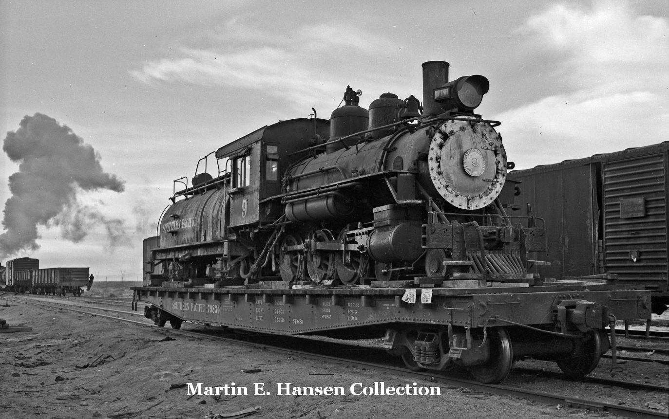 So remote was the Keeler branch, that SP had to load up the last of the operating steam power onto standard gauge flatcars for the trip to the SP shops at Bakersfield, California whenever they were in need of service. We see SP #9 returning from a servicing at Bakersfield in this photo taken in the mid-1950's. This ritual would continue until August 25, 1959 when #9 would make the very last revenue steam run of any SP steam locomotive.