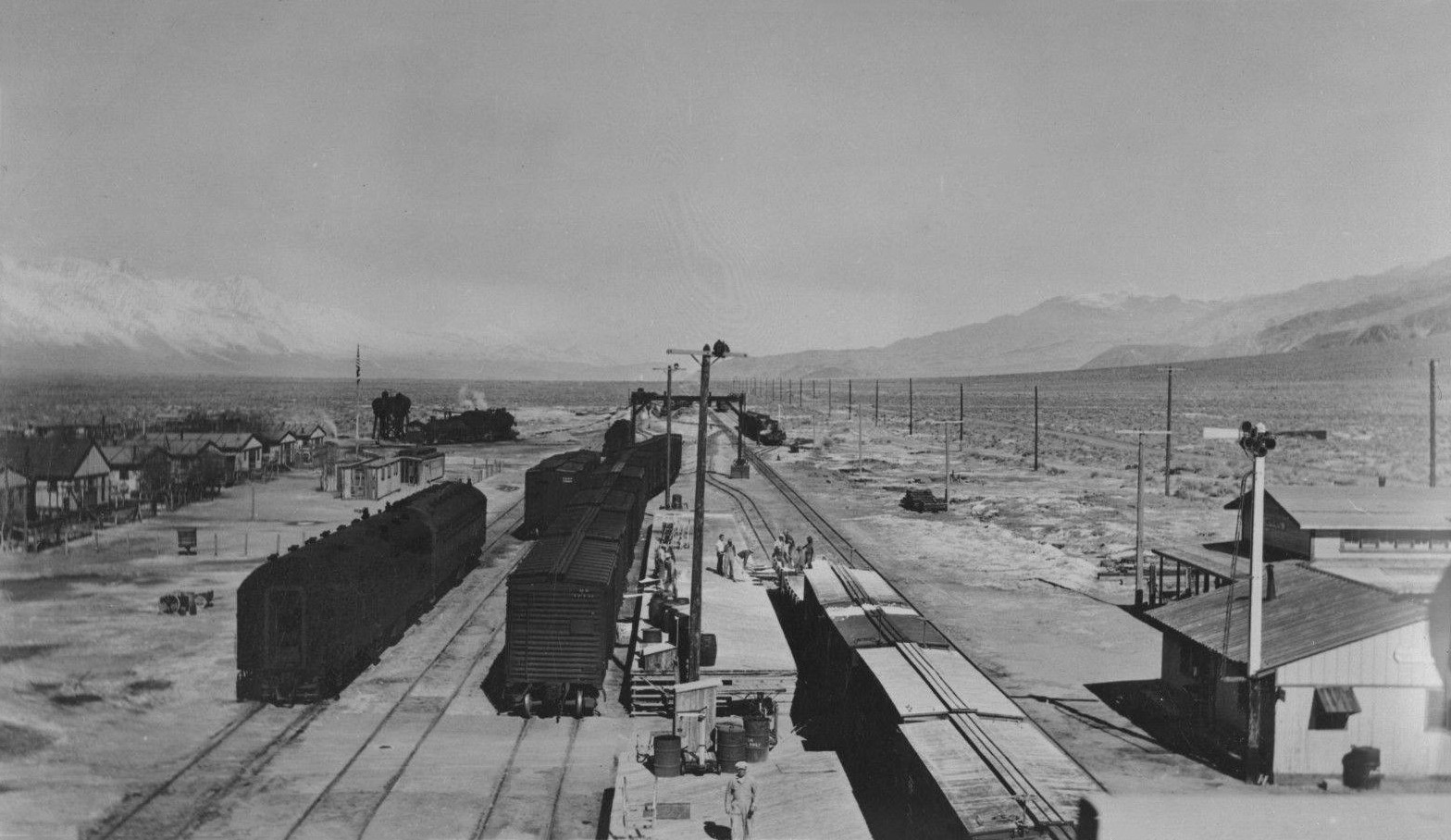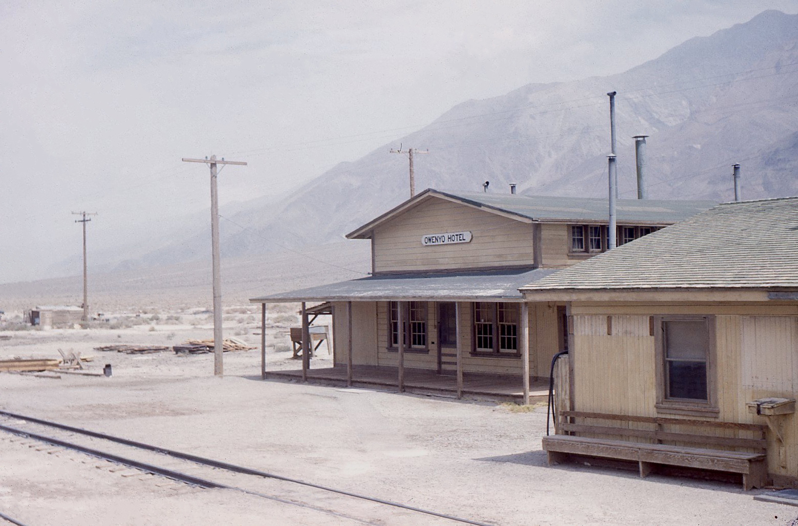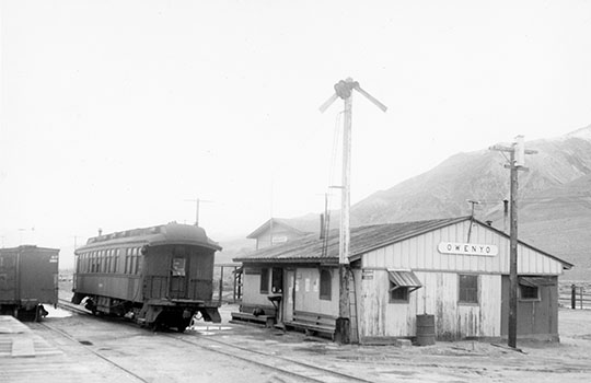 Combine-caboose 401 stands by the Owenyo depot, while her crew switches the yard. The word Owenyo is a contraction of the words "Owens" Valley and "Inyo" County.