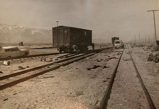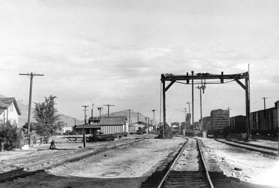 When the standard gauge "Jawbone Branch" was completed to Owenyo in 1910, interchange facilities were constructed at the new junction, as well as a depot and hotel. At the south end of the yard a transfer trestle was built to allow minerals to be dumped from the narrow gauge cars into broad gauge equipment.