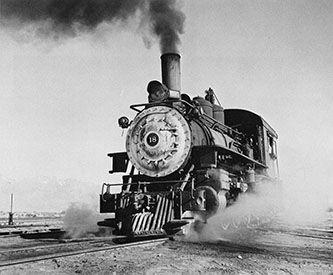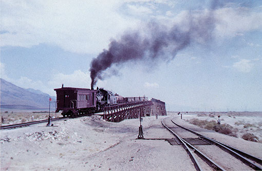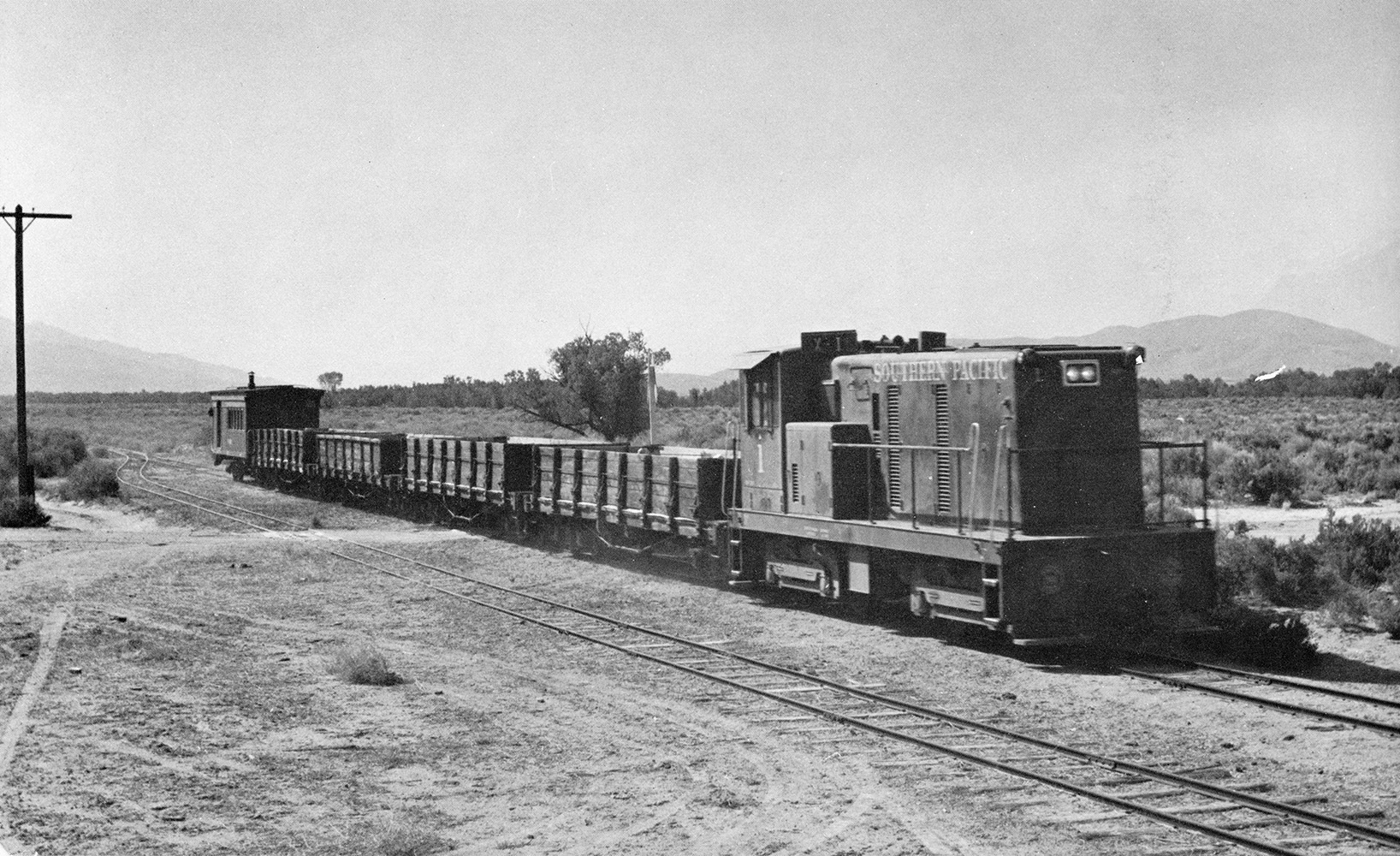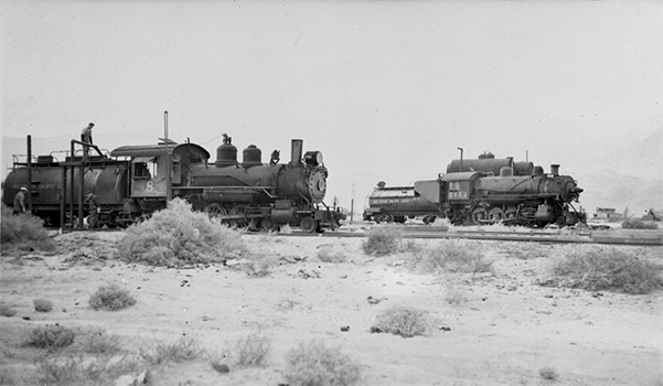 Originally rails of the Carson & Colorado, which began farther north in Virginia & Truckee country in the 1880s, this three-foot venture stretched hundreds of miles south into Owens Valley. Mining of precious metals had been the promise up north; down here there was some ore too - but also soda and potash deposits. There was a future for the C&C - the builders thought. But, like most mining ventures, it worked out differently. Different too was the reason Southern Pacific bought the southern portion of the Carson & Colorado in 1900. They were going to standard-gauge it and run through from Southern California to their mid-continent Overland Route - and so to Salt Lake and the East. But, at this time, the Harriman Interests took over S.P. And the Harriman-run Union Pacific was taking over the San Pedro, Los Angeles & Salt Lake - to provide the much more direct route from the Southland north and east.