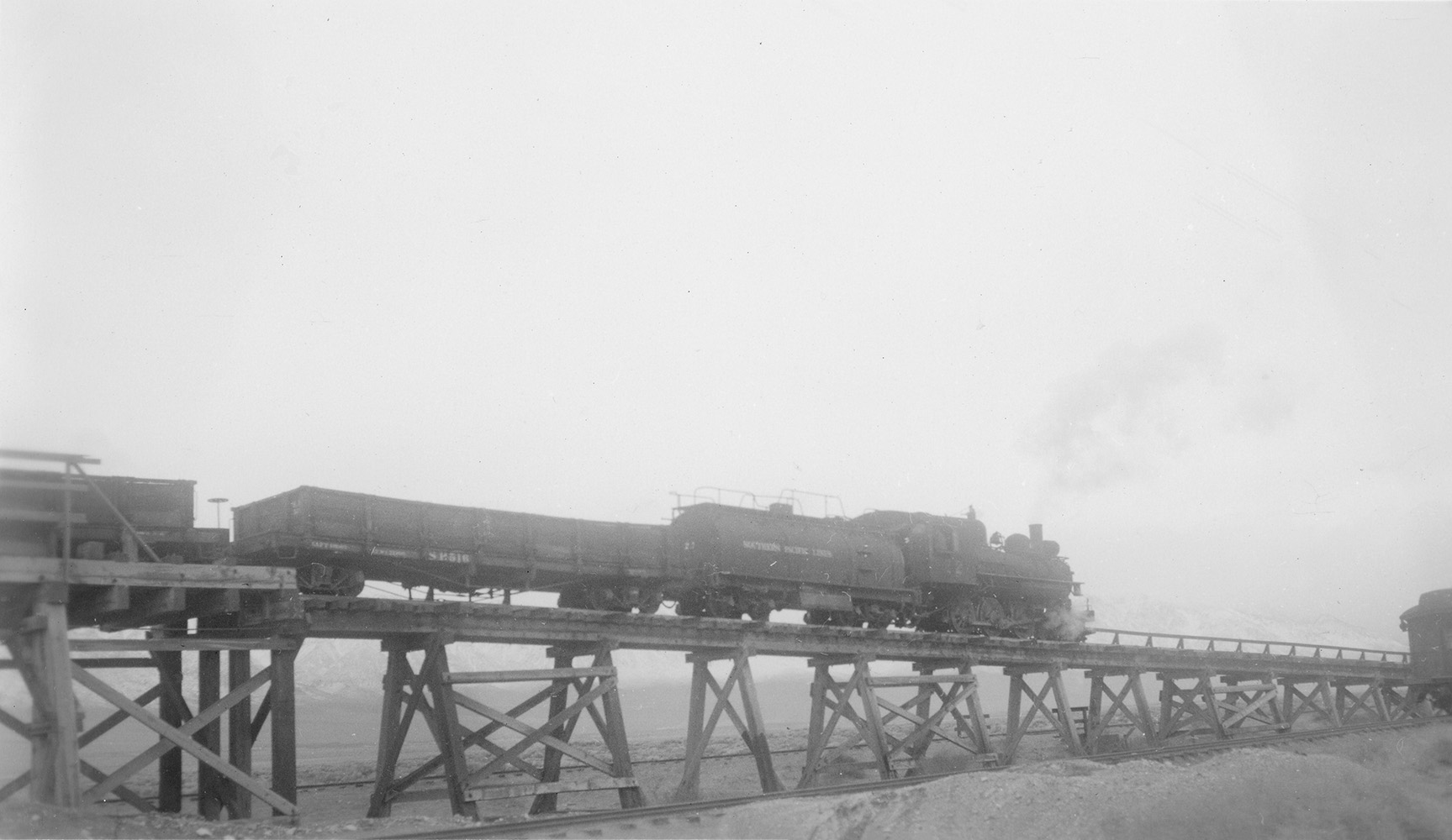18 passes the Owenyo Station transfer trestle on a run from Keeler