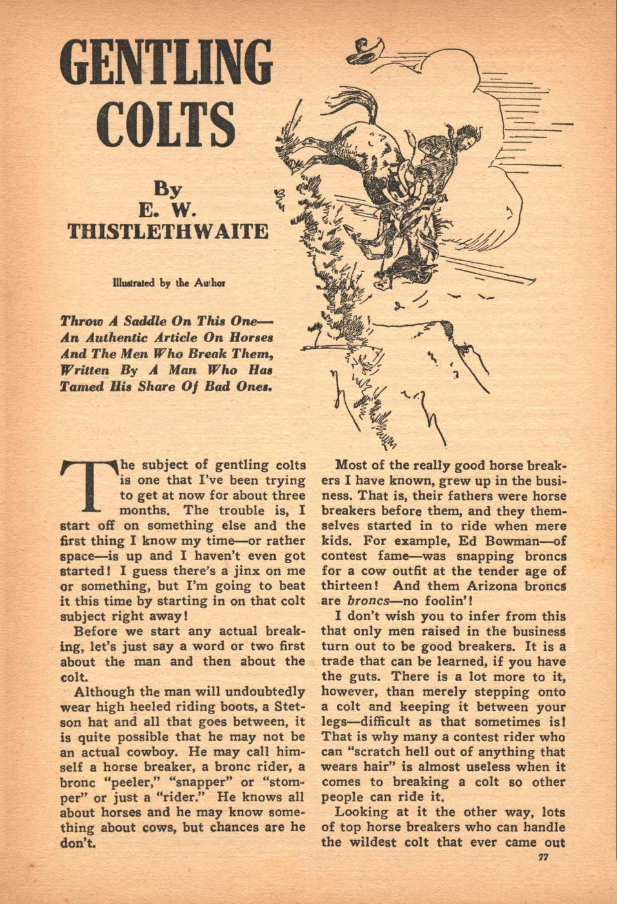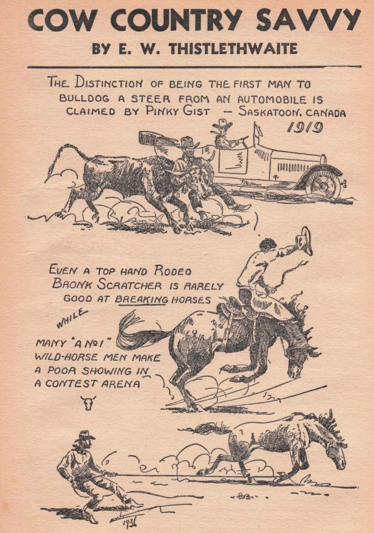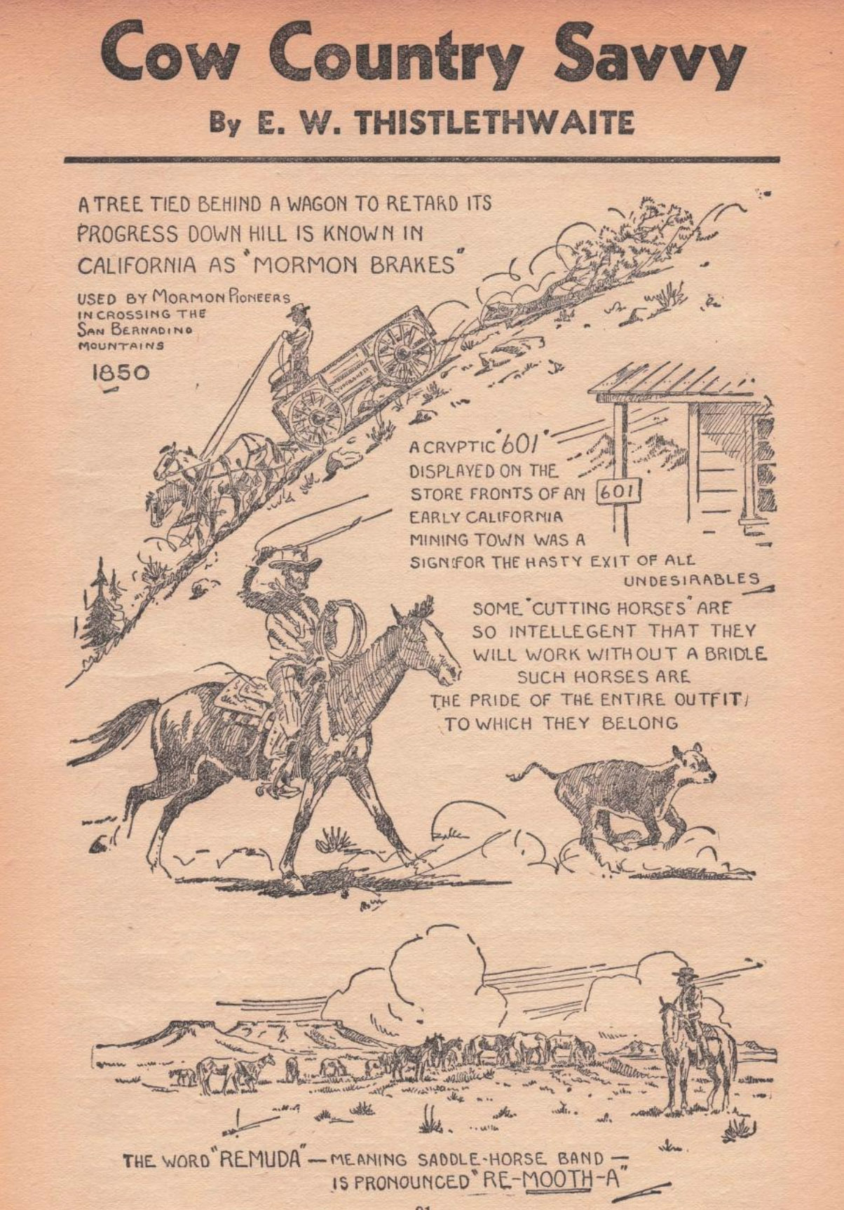 Edgar Wray Thistlethwaite was a Canadian cowboy, dude wrangler, Sierra Nevada packer, author, and western artist in California from the 30's until his death in the 50's! He had a college degree but loved the cowboy life, so much so that he followed it and authored many articles on the west as well as painting it. He did about 50 sketches for Cutter laboratories and had many paintings over the west, Barstow, CA among others! He published cowboy information illustrations in western pulp magazines. He and I (Dean Guthery) were in Barstow for the 1947 rodeo! He was a cowboy on the VX Bar Ranch out of Barstow. He packed for Mt. Whitney Pack Trains in the 1940's. He was my (Dean's) Dad's best friend and he and I packed mules and wrangled dudes together out of Independance, Cal. in 1947. If I remember correctly he told me he had a brother and sister ( or more) who were college professors. I don't remember where. He and his mother were in Piru 1930 census!
