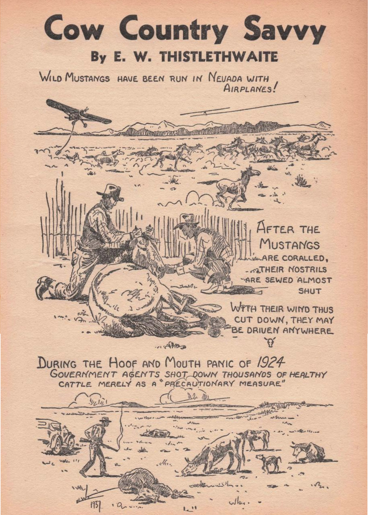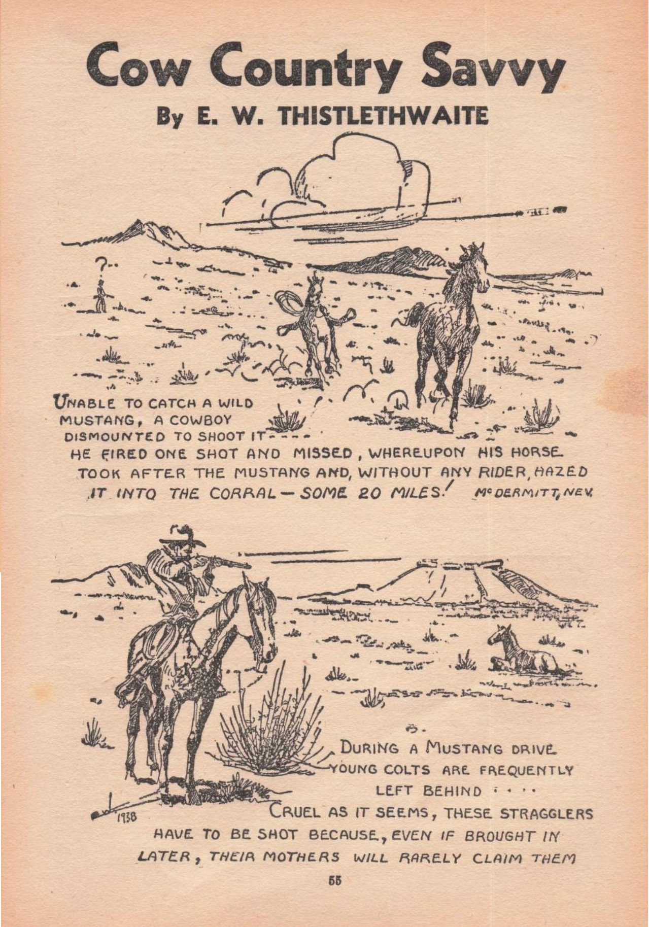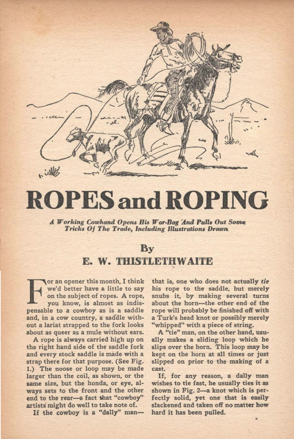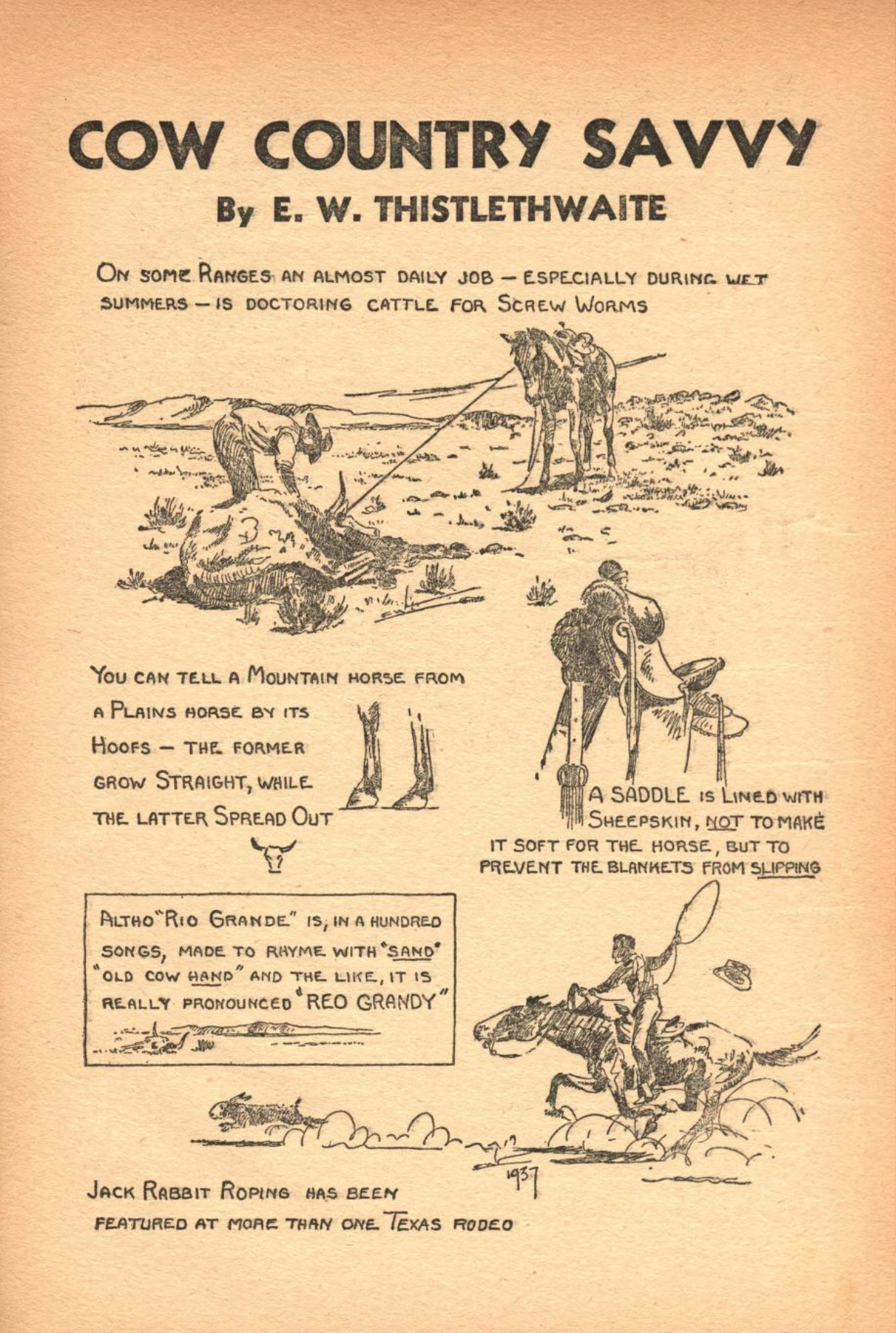 Edgar Wray Thistlethwaite was a Canadian cowboy, dude wrangler, Sierra Nevada packer, author, and western artist in California from the 30's until his death in the 50's! He had a college degree but loved the cowboy life, so much so that he followed it and authored many articles on the west as well as painting it. He did about 50 sketches for Cutter laboratories and had many paintings over the west, Barstow, CA among others! He published cowboy information illustrations in western pulp magazines. He and I (Dean Guthery) were in Barstow for the 1947 rodeo! He was a cowboy on the VX Bar Ranch out of Barstow. He packed for Mt. Whitney Pack Trains in the 1940's. He was my (Dean's) Dad's best friend and he and I packed mules and wrangled dudes together out of Independance, Cal. in 1947. If I remember correctly he told me he had a brother and sister ( or more) who were college professors. I don't remember where. He and his mother were in Piru 1930 census!