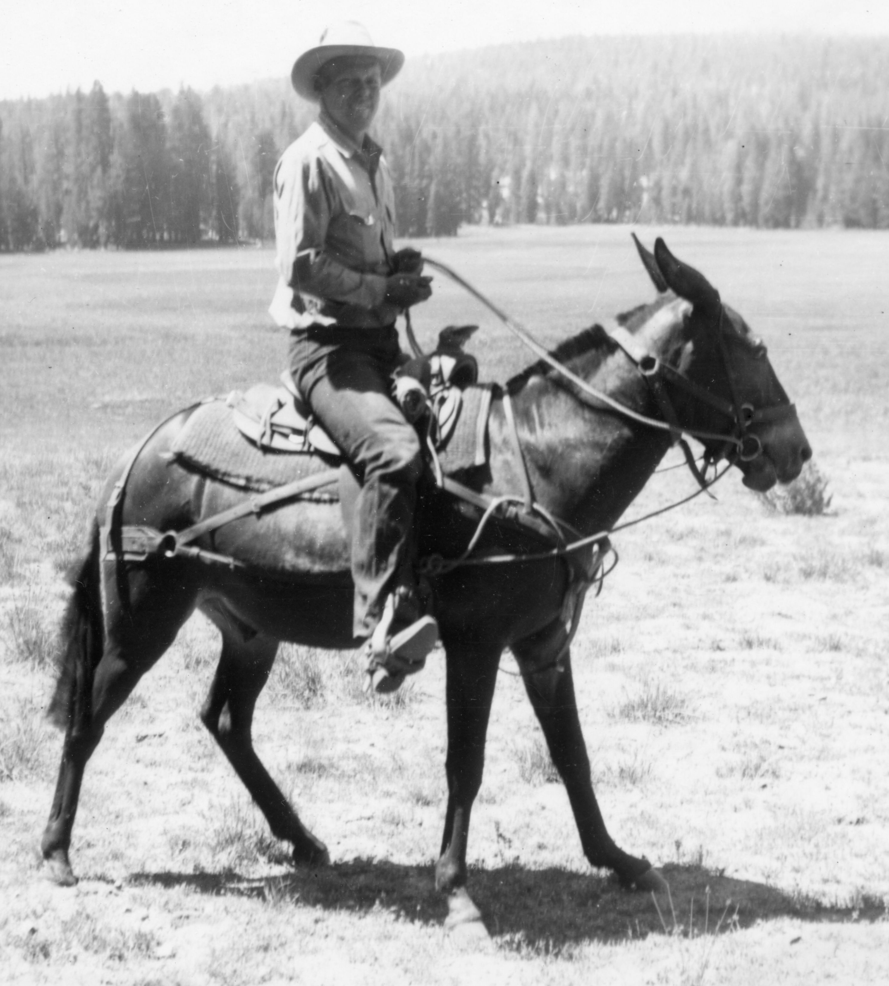 One interesting day in July 1949 Frank Chrysler was in camp and asked me to help him bring in some horses that had been grazing for two weeks in the south fork meadows and of course, I said yes anxiously. It was a five hour escapade, but it was successful running this stock (horses and mules) some five miles through forest, meadows, and stream back to the corral at GTC. GTC had two separate pastures fenced with three meadows in one and one meadow in the other.