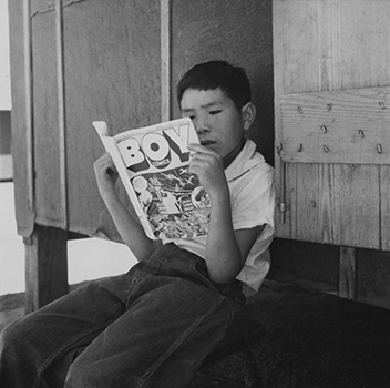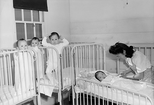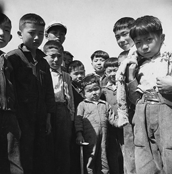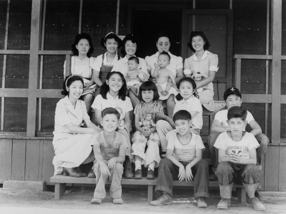 The Nakai family from L/R: Mitsu, half-length portrait, standing, and, seated on a cot, Margaret, with a baby on her lap, Jane, a young girl, looking at a photo album, and Roy, a young boy.