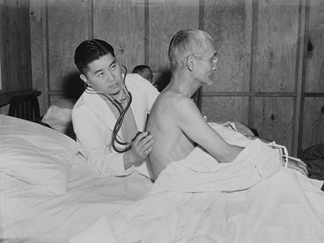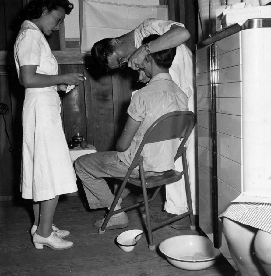Women's ward in temporary barracks hospital at the WRA. The new hospital with accomodations for 250 beds is almost ready for occupancy. - 1942