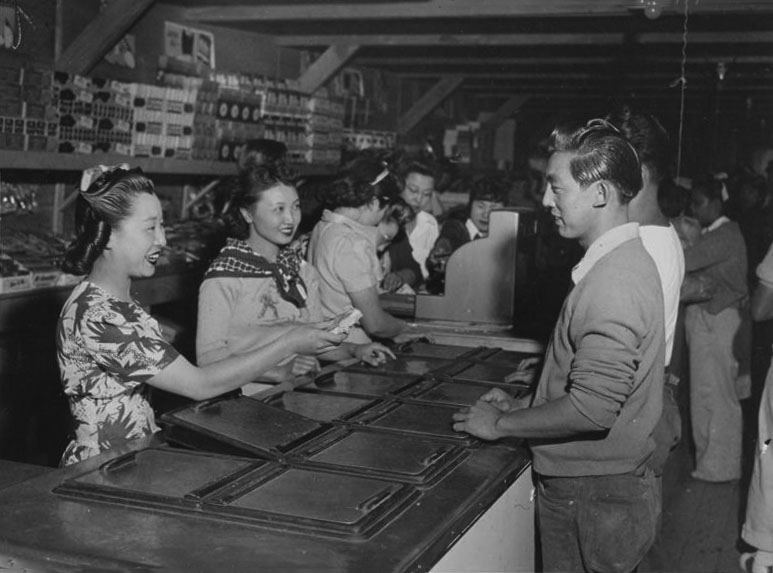 Mrs. Yaeko Nakamura and family buying toys with Fred Moriguchi