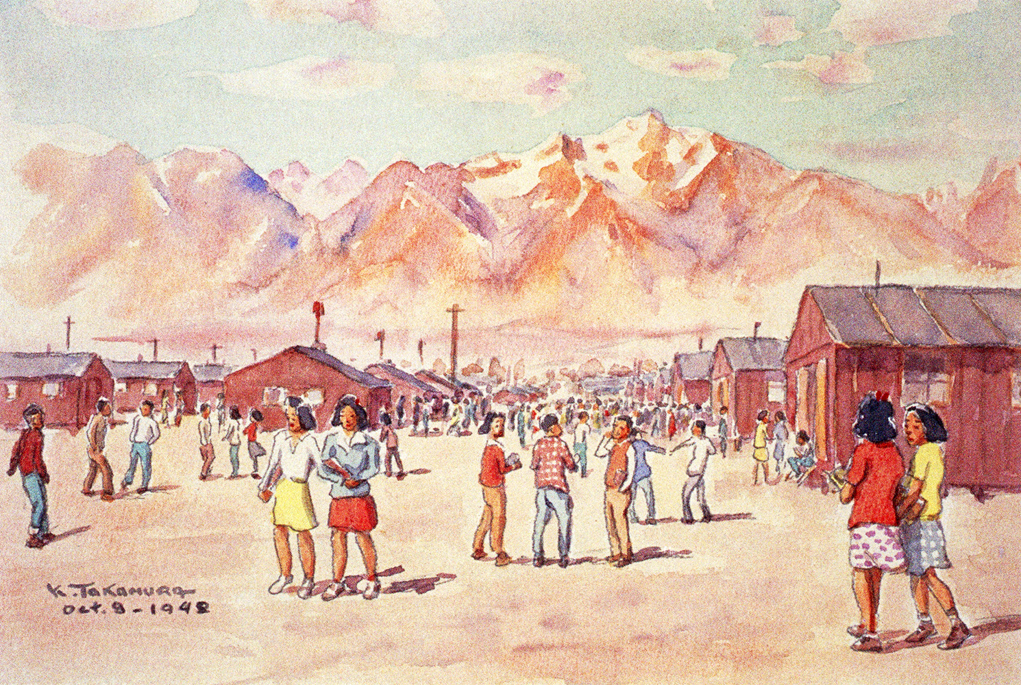 Kango Takamura (1895-1990) was an photo retoucher for RKO Studios in Los Angeles when Pearl Harbor was attacked by the Japanese Imperial Navy. He was detained by the FBI in 1942 after offering to sell a motion-picture camera to a visiting Japanese general. He was incarcerated at Santa Fe, New Mexico for several months and then moved to a camp at Manzanar, California, where he joined his wife, daughter, son-in-law and granddaughter. He remained at Manzanar with his family until 1945. While at Manzanar, Takamura depicted his surroundings in drawings and watercolors. He also worked as a camp sign-maker at Santa Fe and as curator for a small museum at Manzanar. After the war, he returned to Hollywood and worked at RKO Studios for another twenty-five years before retiring. The collection consists of 77 watercolor paintings produced during World War II while Kango Takamura was detained at the Santa Fe Internment Camp, New Mexico, and the Manzanar Internment Camp, California. Also included are paper mounts and one photographic reproduction of a painting.