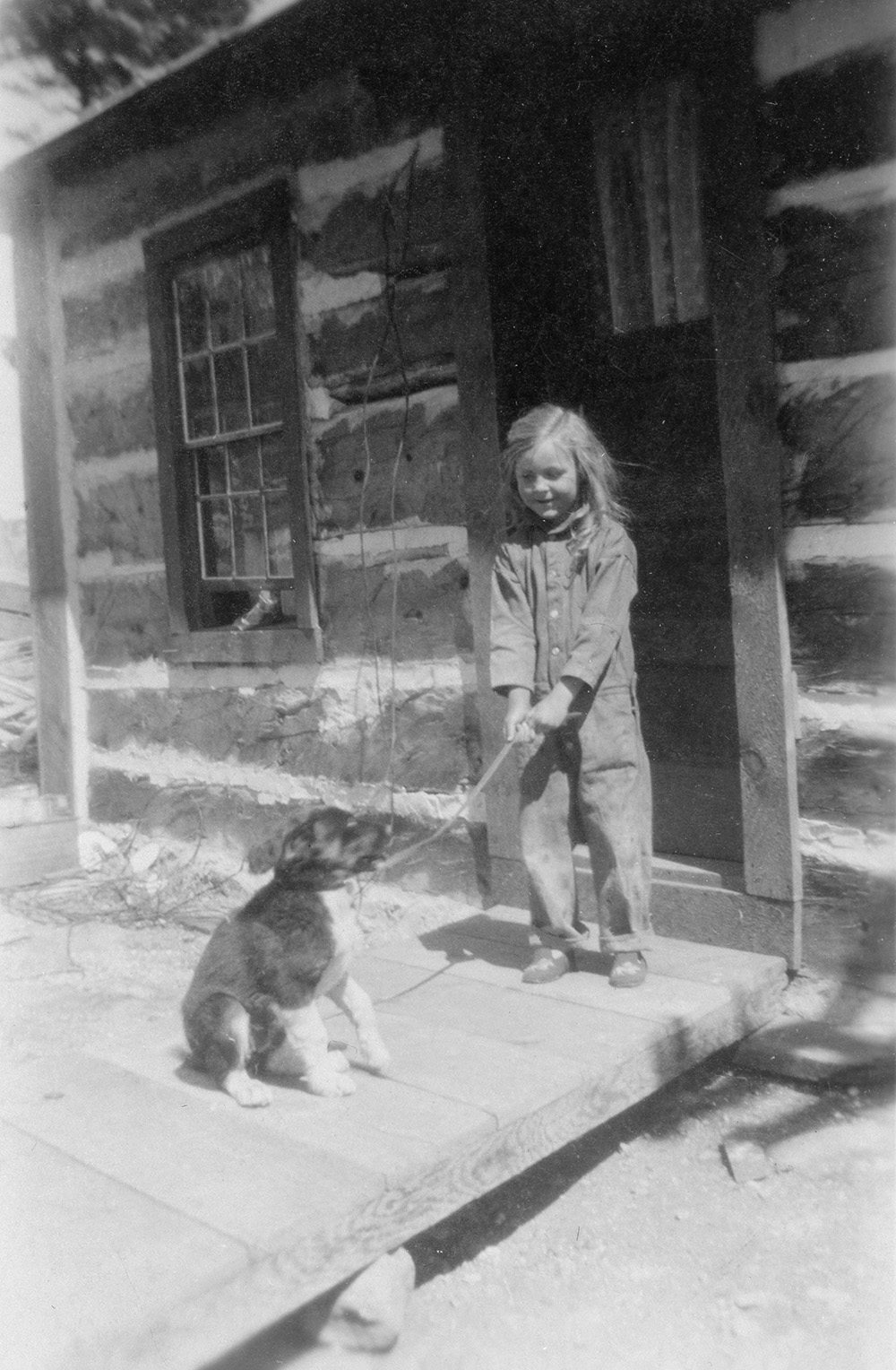 Barbara Yerby and unknown pup in front of the log cabin at Tom's Place |